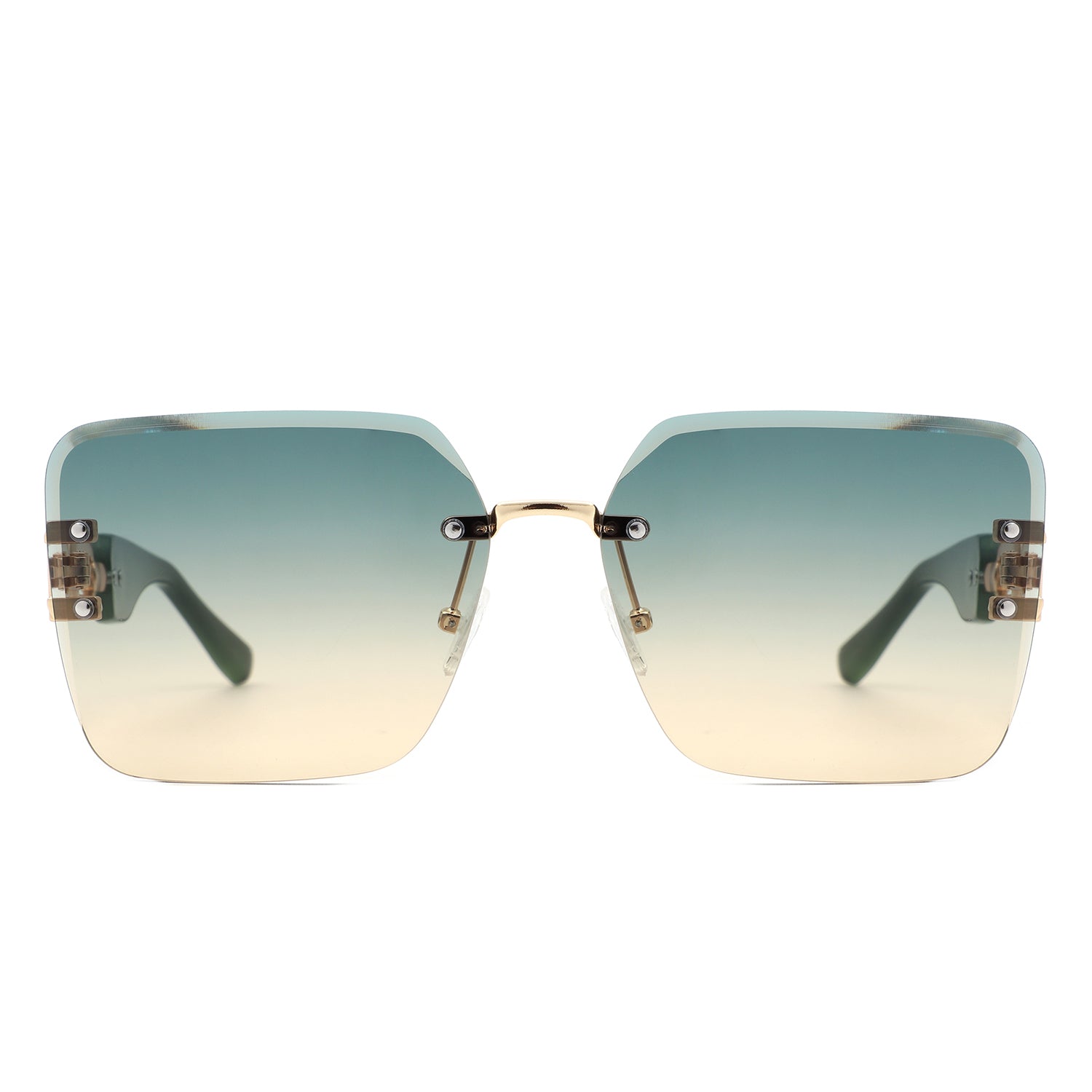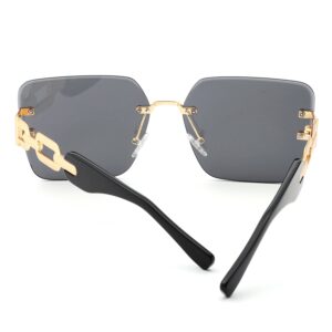 These sunglasses are designed for everyday outdoor wear and general eye coverage in bright conditions. They feature a rimless square lens design with decorative chain link elements and PC lenses supported by metal and plastic frame components. The frame width measures 144 mm, with a lens width of 64 mm and lens height of 54 mm. The bridge width is 16 mm, and the temple length is 147 mm, providing a standard fit for most adult users.