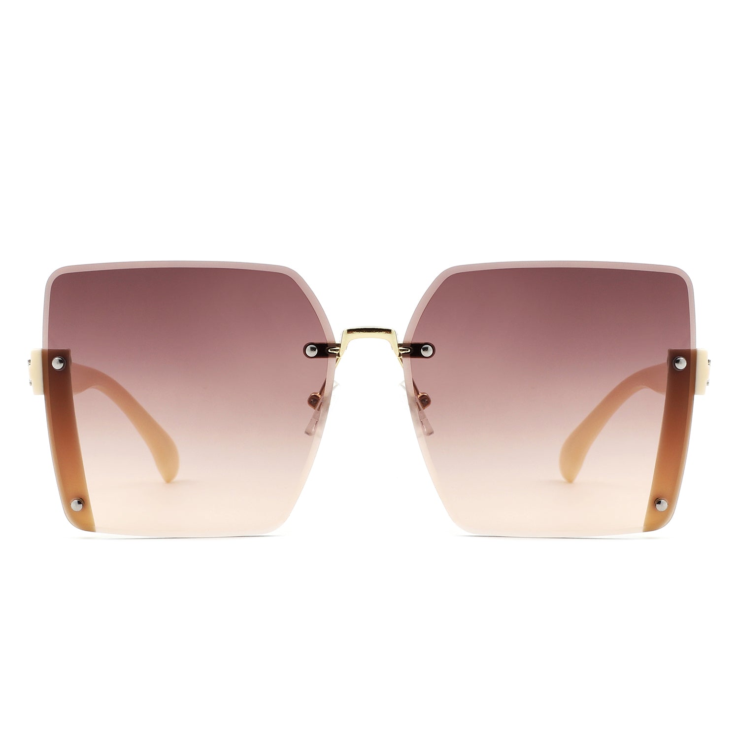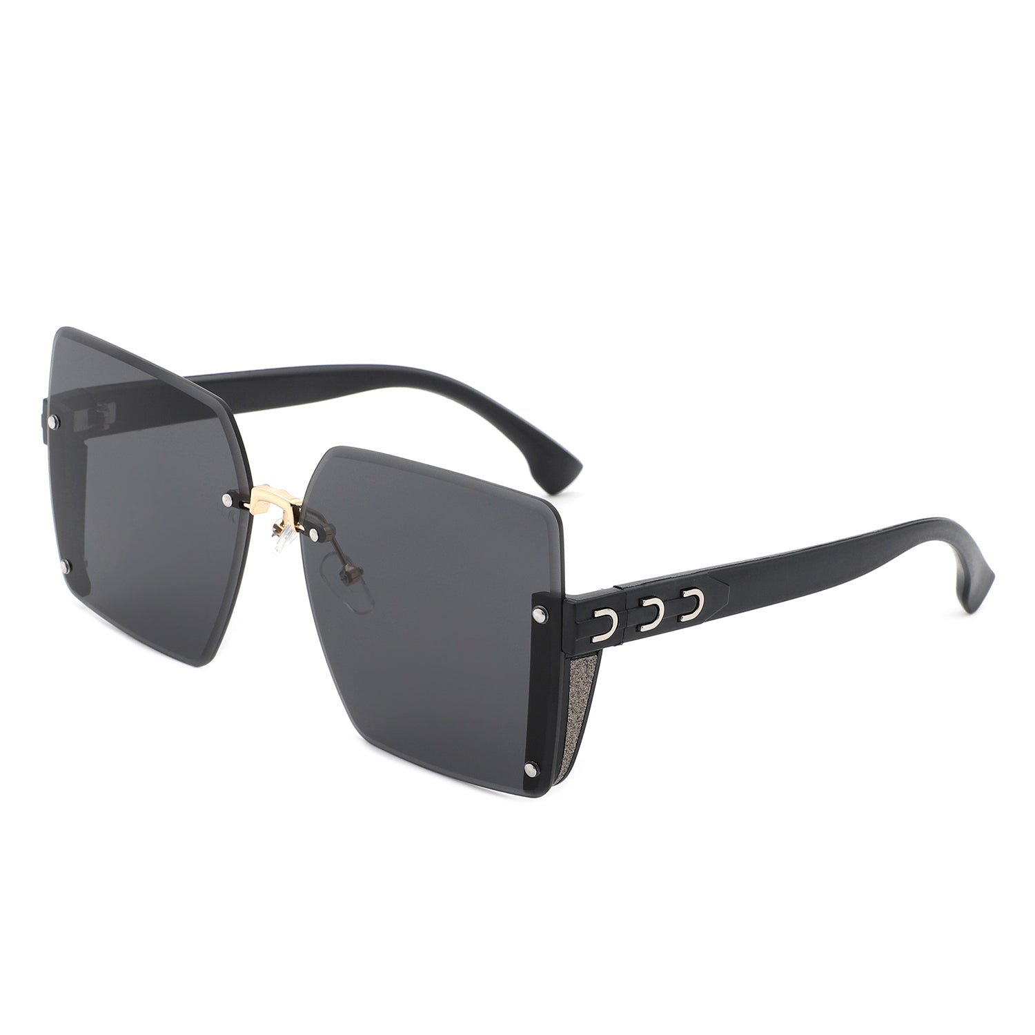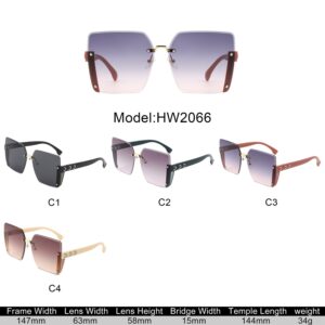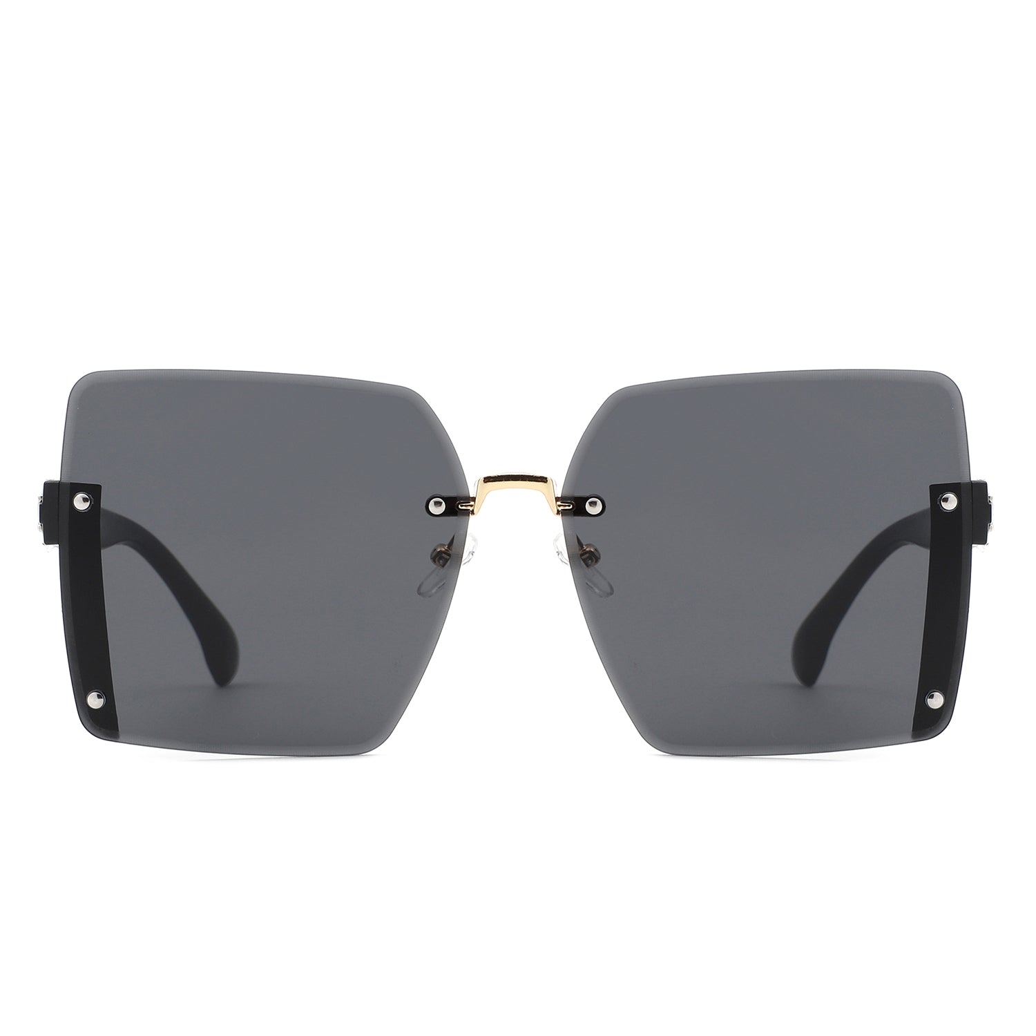 These sunglasses are designed for everyday outdoor use and general eye coverage in bright conditions. They feature a rimless square frame with PC lenses supported by plastic frame components and a flat top profile. The frame width measures 147 mm, with a lens width of 63 mm and lens height of 58 mm. The bridge width is 15 mm, and the temple length is 144 mm, providing a standard fit for most adult users.
